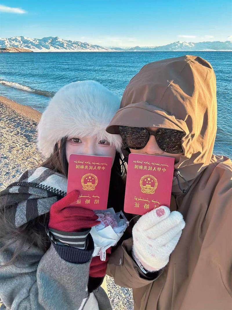 王清羽和丈夫都是贵阳人。他们从贵阳出发,辗转六七个小时的飞机才来到新疆,只为在赛里木湖领一本结婚证。