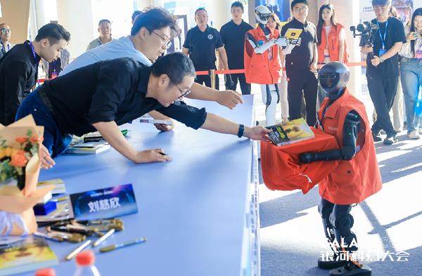 当然也有真的不是真人的——作为京东特邀机器人志愿者的星动纪元超拟人服务机器人星动Q5就吸引了众多参会者的目光。只见它小小的个子穿行在人群中,化身“书迷向导”,从接待、导览、讲解、引导秩序、带货到表演跳舞等无所不能,甚至作为第一个机器人幻迷,也参与了签售环节,和大刘热情互动并荣幸地拥有了作家亲签书籍。