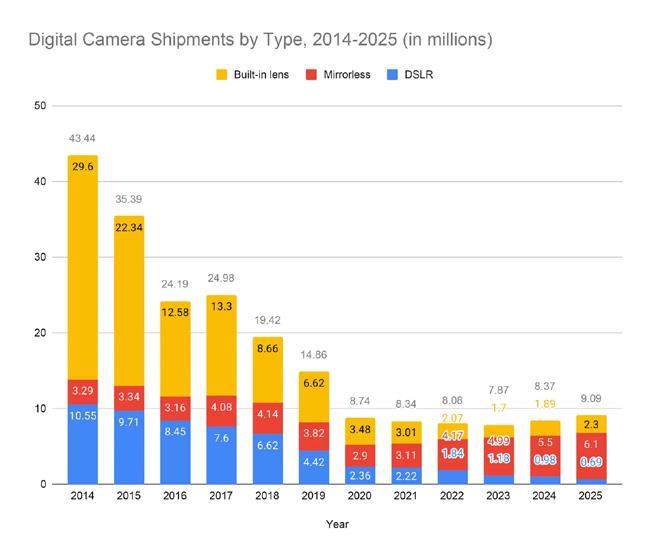 自2017年起,全球数码相机的出货量逐年下降,从2498万台锐减至2023年的787万台,创下了行业新低谷。这样的趋势令许多摄影爱好者和业内人士感到担忧。然而,2024年,出货量回升至837万台,标志着行业的初步复苏。2025年,数码相机出货量进一步攀升至944万台,创下自疫情暴发以来的最高纪录。