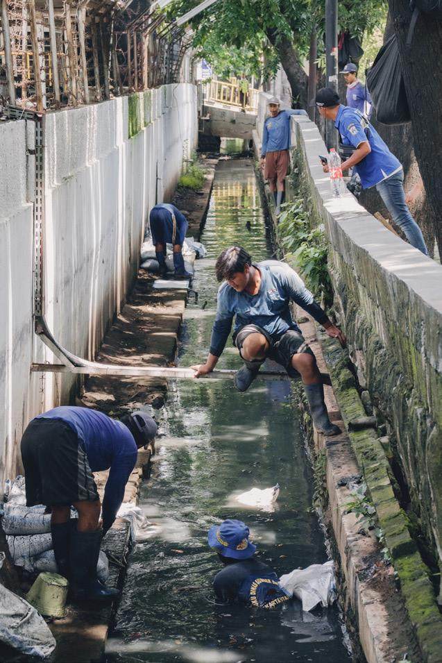 2蓝色部队的工作人员在维护雅加达的一条工业排水渠。©阿比扬·马达尼(Abyan Madani)