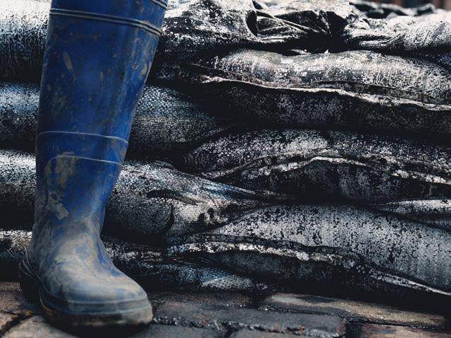 3蓝色部队工作人员的靴子特写,旁边是散发恶臭的污泥袋。©阿比扬·马达尼(Abyan Madani)